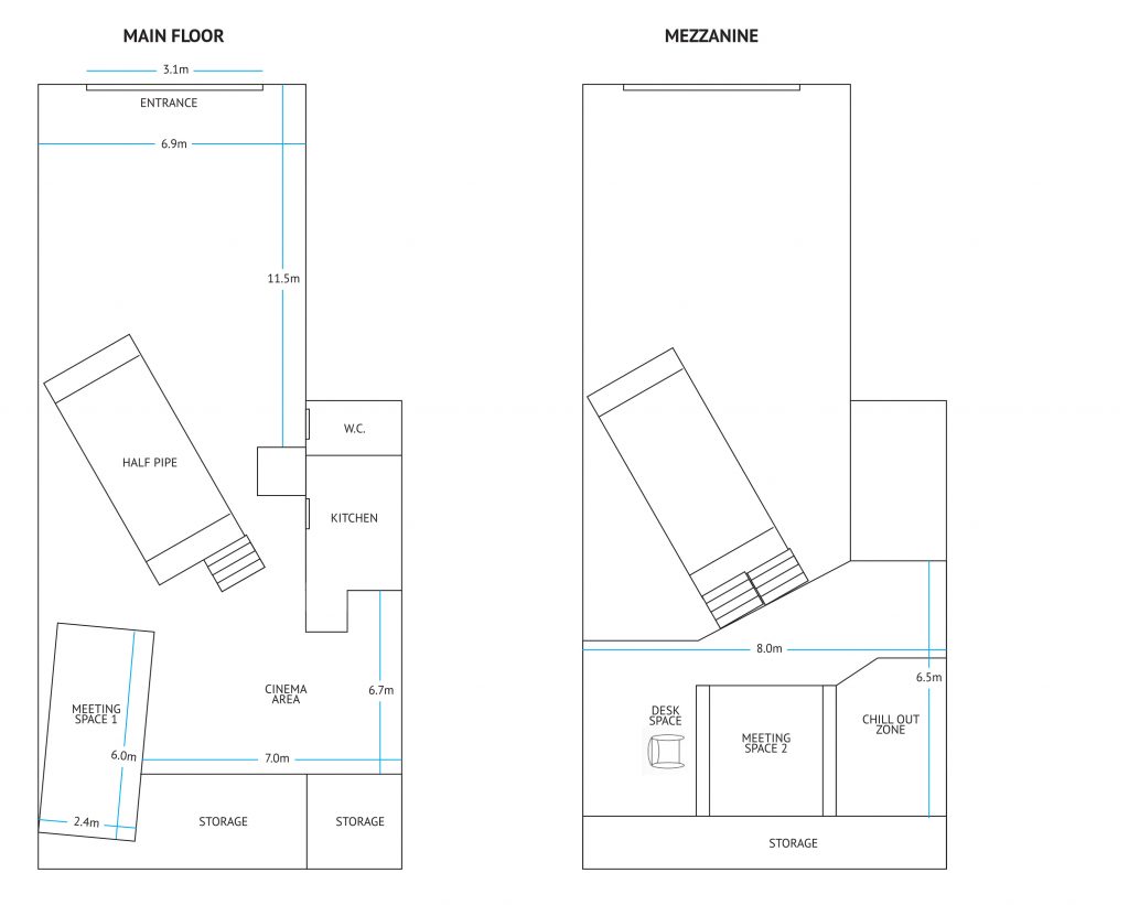 The space boasts a number of unique features like a half pipe with inbuilt stairs leading to our upper mezzanine level, a wood-fired pizza oven, a shipping container meeting area, a cinema room and even a swing.